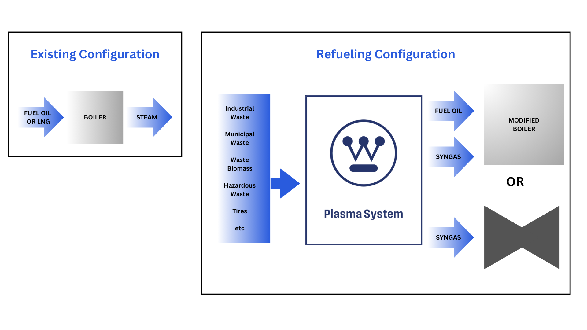 Refueling reduces or eliminate customers consumption of fossil fuels by gasifying waste feedstocks such as municipal solid waste, tires and automobile shredder residue (also known as auto-fluff) to produce syngas which is then burned in place of the fossil fuels.